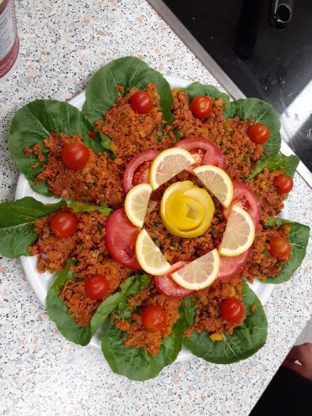 Hasan lies uns so einiges ausprobieren, wie zum Beispiel das feine „Baba Ghanoush“ - eine Auberginencreme, abgerundet mit feiner Sesam-Tahini, Knoblauch und Zitrone. Auch durften die feinmotorischen Fingerübungen beim Drehen der leckeren gefüllten Weinblätter (Yalanji) nicht fehlen. Ein besonderes Highlight für Viele war der Nachtisch – „Knafeh“ – ein Kuchen aus süß- knusprigen Fäden mit Pistazien.
