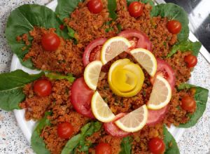 Hasan und Samer hatten an vier Kochstellen schon viel vorbereitet, um Baba Ganoush, ein Auberginenpüree, und Molokhyia mit gebratenem Hähnchen zuzubereiten. Einige Helferinnen wuschen dafür sorgfältig die getrockneten Blätter einer Art Spinat. Nebenan schnitt man riesige Petersilie-Büschel in feine Streifen. Mit Tomaten, Minze, Bulgur, Olivenöl, Minze und Granatapfelsirup wurden sie zu Tabouleh, einem sehr vitaminreichen Salat, verarbeitet. Außerdem wurden syrischer Fadennudelreis und gefüllte Weinblätter mit Kartoffeln gekocht. Alleine 37 Zitronen waren für die verschiedenen Gerichte auszupressen. Als die Mägen bereits leise knurrten, schob Hasan noch schnell Babousa in den Ofen, einen Grieskuchen mit Kokos und Mandeln.