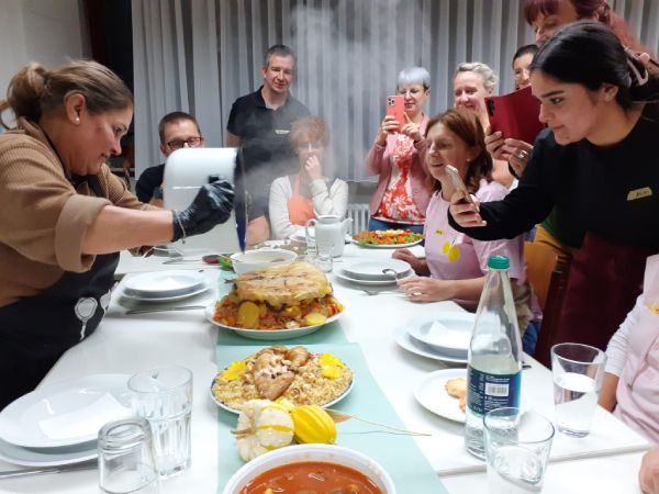 Der schön gerichtete Tisch bog sich beinahe unter all den Speisen, die in bester Stimmung gemeinsam genossen wurden. Einiges davon wurde in Plastikbeutelchen zusammen mit der schön gestalteten Rezepte-Sammlung mit nach Hause genommen. Ein paar Teilnehmerinnen fragten zum Abschied, wann der nächste Kochkurs stattfindet. Ein Kompliment für den umsichtigen Hasan, der sich sichtlich freute, wie gut das Essen aus seiner alten Heimat auch den Menschen in der neuen Heimat schmeckte.